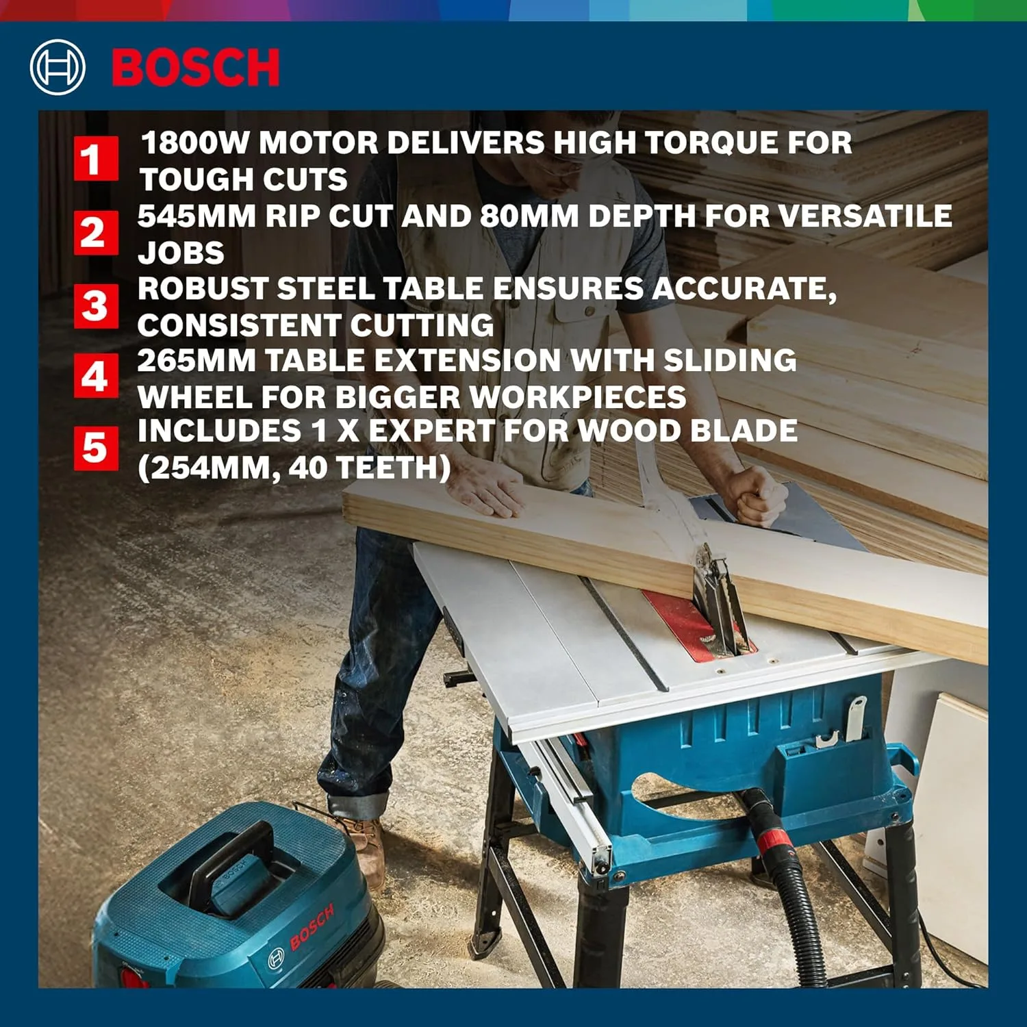 It features a large 545mm rip capacity which allows you to handle wide boards and panels with ease. This makes it suitable for furniture making, cabinetry, and construction work.