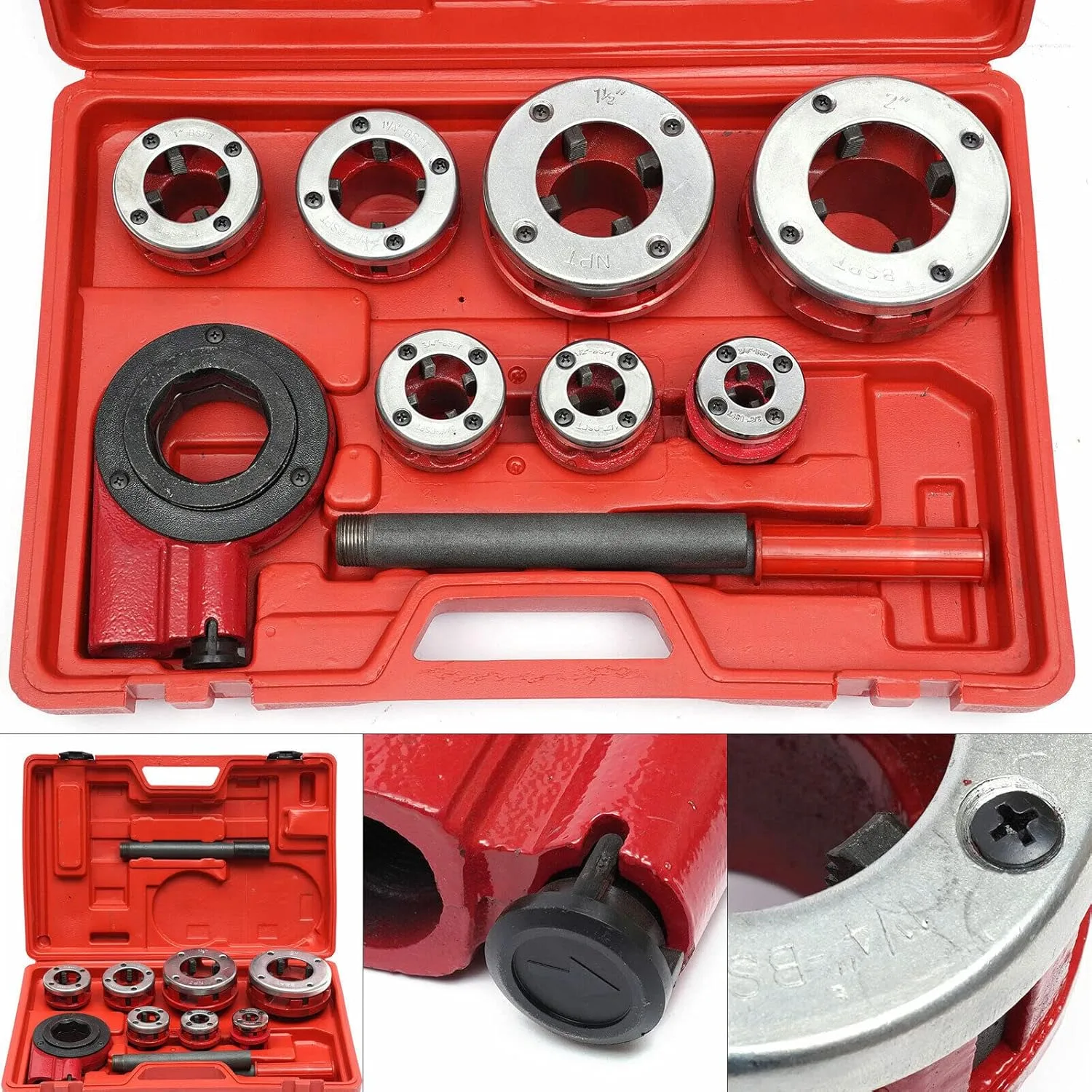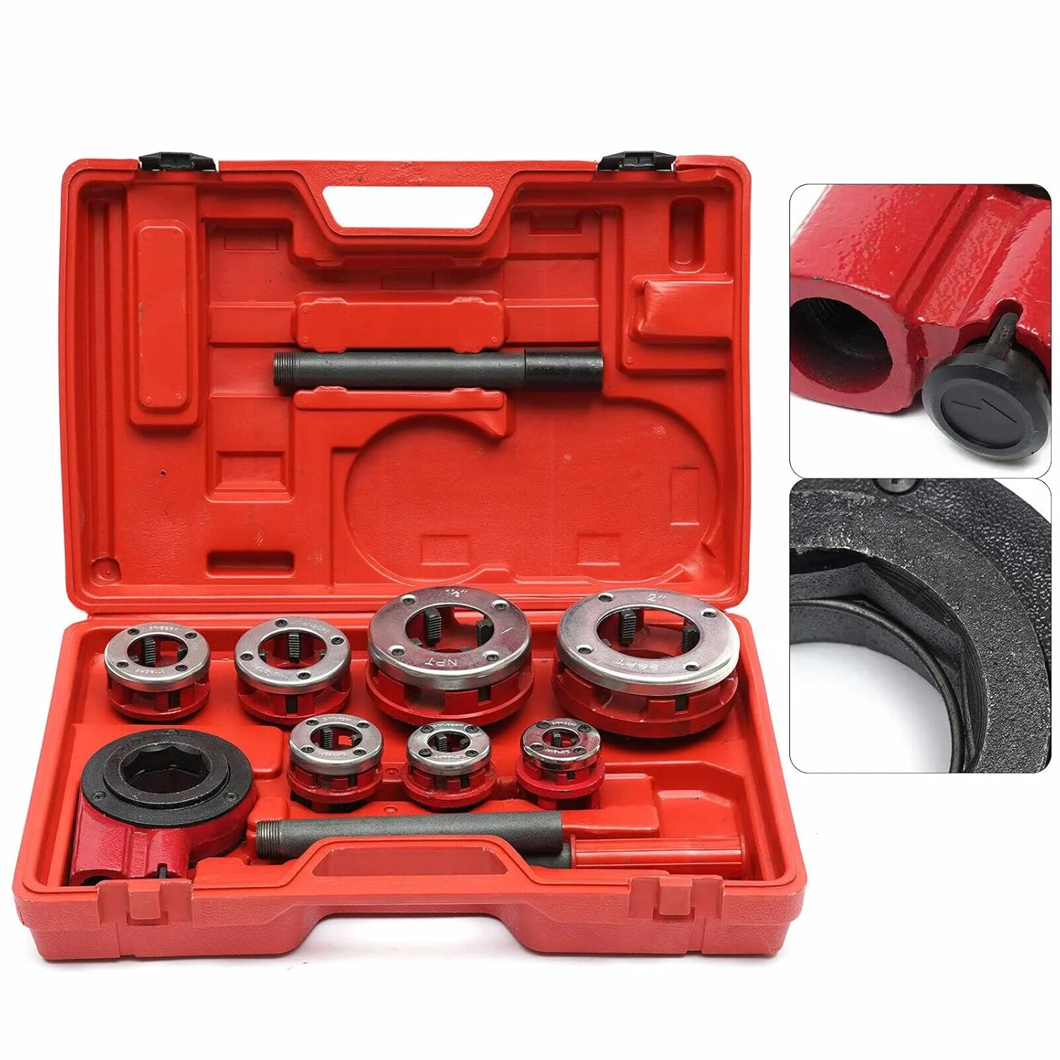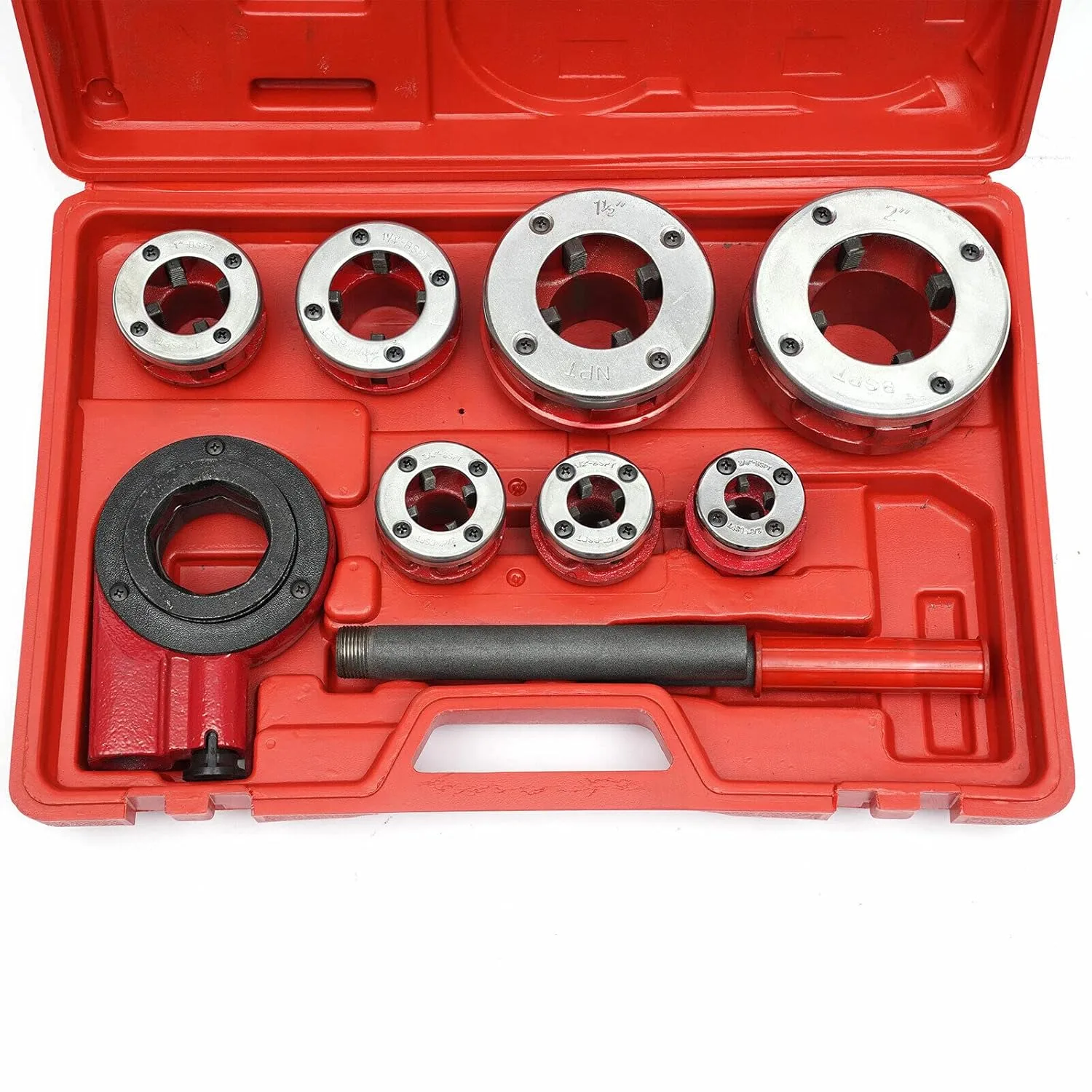 Manual ratcheting pipe threader set with 7 dies for clean and accurate threading of metal pipes.