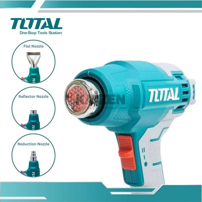 The TOTAL TBL2002 cordless heat gun provides 300°C and 550°C temperature settings for various heating applications. It features dual airflow options of 100 and 200L/min for controlled performance. Battery and charger are sold separately.