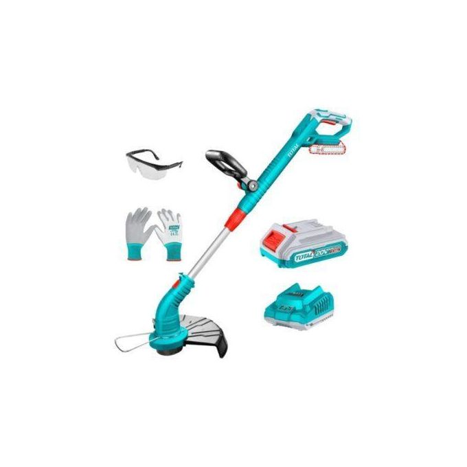 The TOTAL TGTLI20301 lithium-ion grass trimmer delivers 8200rpm no-load speed and 300mm cutting diameter. Designed for efficient trimming with 1.6mm twisted line and 5m line length. Includes battery, charger, and protective accessories.