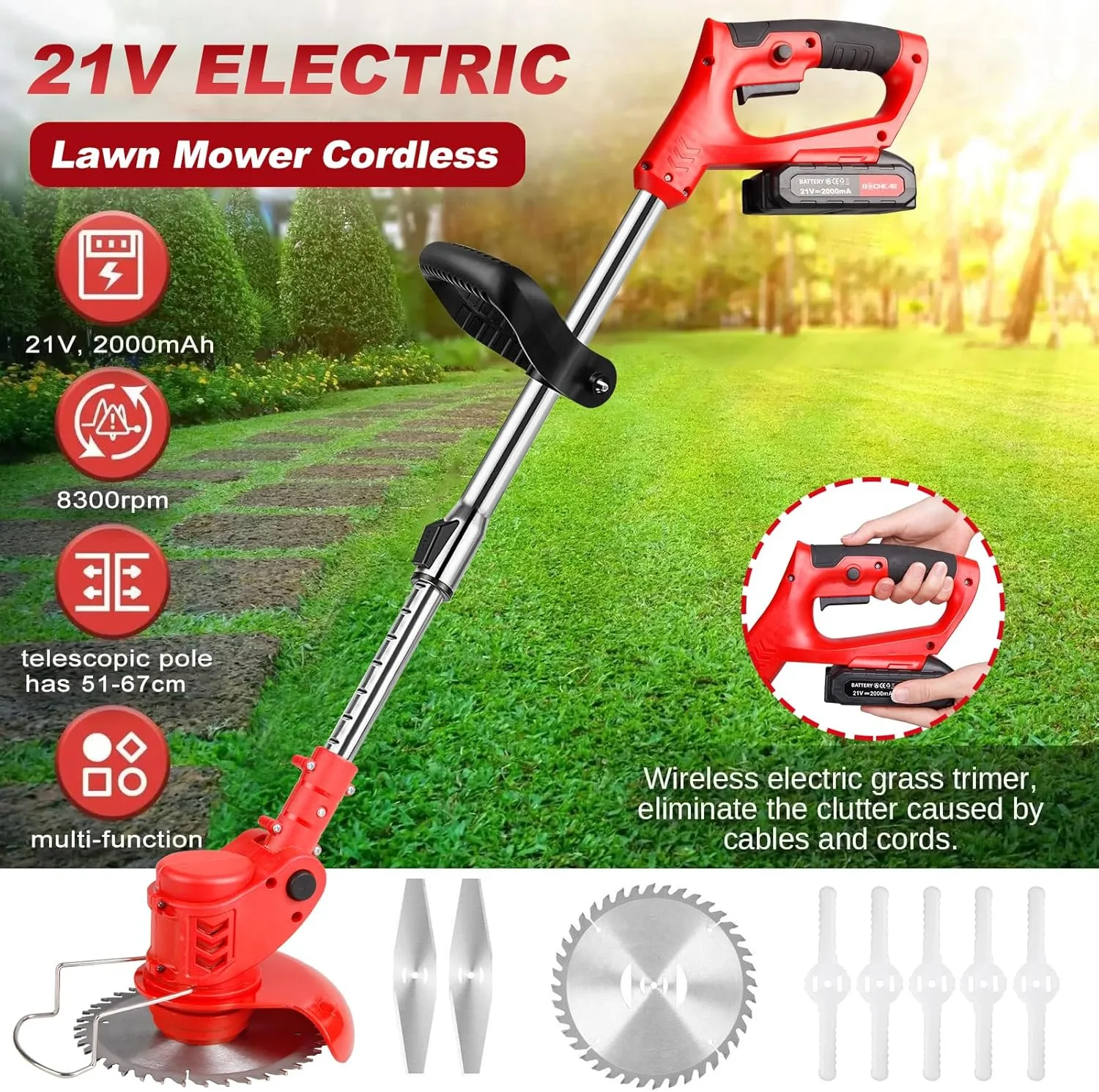 21 V cordless grass trimmer kit with dual batteries, high-speed motor (~8,300 rpm), and included trimming discs/blades for easy grass and weed cutting.