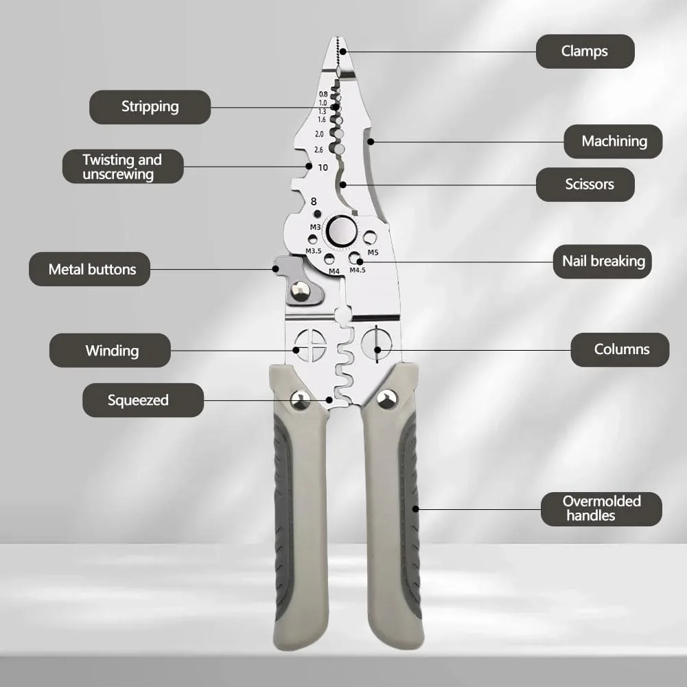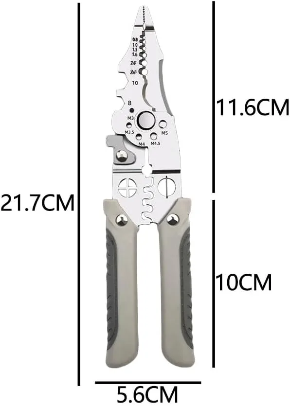 The Multifunctional Wire Stripper is a compact all-in-one solution for wiring tasks. Built with a stainless-steel body and rubber-coated ergonomic handles, it delivers both comfort and control during prolonged use.