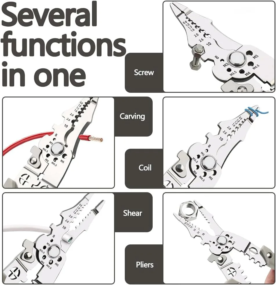 It includes precision stripping holes for multiple wire gauges, a built-in cutter, and a crimping section for terminal connections — making it perfect for electricians, technicians, and DIY users who value efficiency and accuracy.