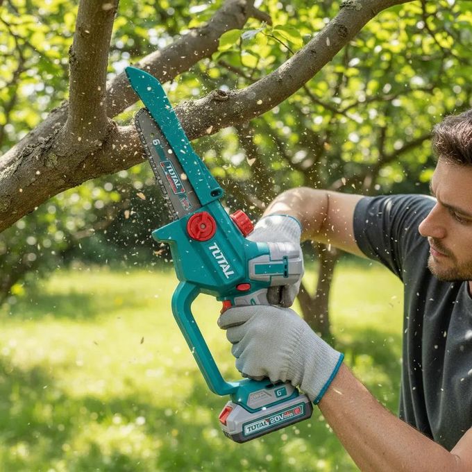 The TOTAL TGSLI201262 cordless chain saw features a 12" (30cm) bar length and 10m/s chain speed. Equipped with quick chain brake function and auto lubrication for enhanced safety and performance.